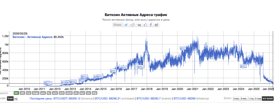 Сетевая активность в блокчейне Биткоина достигла минимальных значений за последние 13 лет, фиксирует платформа BitInfoCharts. По данным ресурса, этой весной число ежедневных активных адресов колеблется в диапазоне от 80 000 до 120 000 — последний раз подобные показатели датировались осенью 2013 года.